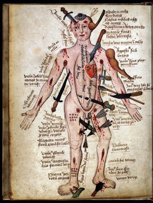 It laid out schematically the various wounds a person might suffer in battle or in accidents, often with surrounding or accompanying text stating treatments for the various injuries. It first appeared in print in Johannes de Ketham’s Fasciculus Medicinae (Venice, 1492) and was used often in surgical texts throughout the sixteenth century and even into the seventeenth century. (Wikipedia)